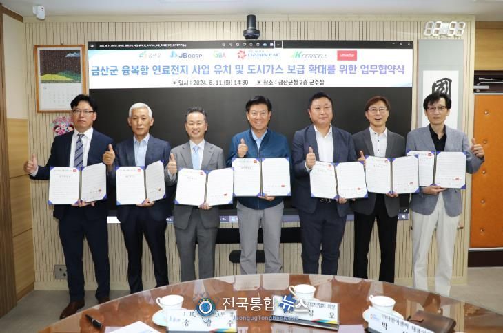 전국통합뉴스 이인복 기자 | 금산군은 지난 11일 금산군청에서 JB㈜(대표이사 우재화), (사)금산군기업인협회(회장 신상오), ㈜다빈이앤씨(대표이사 박상근), ㈜케이세라셀(대표이사 임경태), ㈜리튬플러스(대표이사 전웅), 마전9리 주민(마전9리 이장 한호도)과 융복합 연료전지 사업 유치 및 도시가스 보급 확대 업무협약을 체결했다.