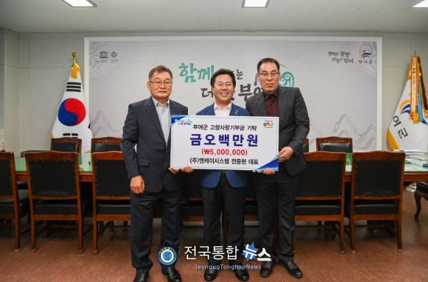 전국통합뉴스 이인복 기자 | ㈜엔케이시스템 전중현 대표(공동대표 서천수)가 지난 18일 부여군에 고향사랑기부금 개인 최고액인 500만 원을 기부했다.