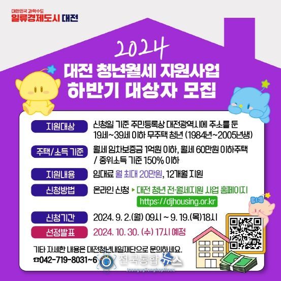 전국통합뉴스 이종구 기자 | 대전시는 9월 2일부터 19일까지‘2024년 대전 청년 월세지원사업’하반기 대상자를 모집한다.