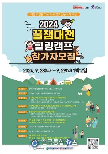 전국통합뉴스 이종구 기자 | 대전시는 관내 주요 캠핑장 및 관광지를 연계한 숙박형 캠핑프로그램‘2024년 꿀잼대전 힐링캠프’ 3회차 참가자를 9월 9일부터 10일까지 2일간 모집한다.