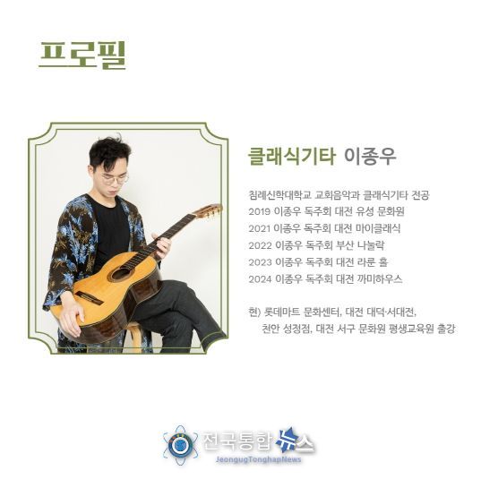 클래식 기타리스트 이종우의 기타 연주로 영화‘금지된 장난’의 OST인 로망스부터 영화 ‘괴물’의 OST인 눈 오는 매점까지 다양한 공연을 펼칠 예정이며 관람료는 무료이다.