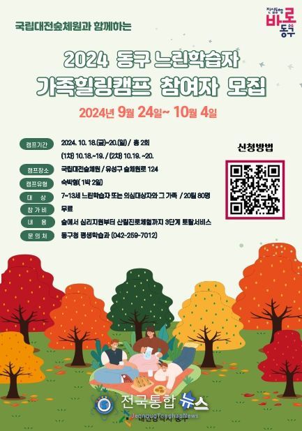 전국통합뉴스 이종구 기자 | 대전 동구는 국립대전숲체원과 함께 느린학습자와 그 가족을 위한 특별한 힐링캠프 ‘느린학습자 가족캠프’를 운영, 이달 24일부터 대상자를 모집한다고 밝혔다.
