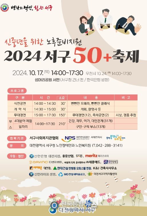 전국통합뉴스 이종구 기자 | 대전 서구가 오는 17일 샘머리공원에서 중장년을 대상으로 노후준비지원 ‘2024 서구 50플러스 축제’를 개최한다.