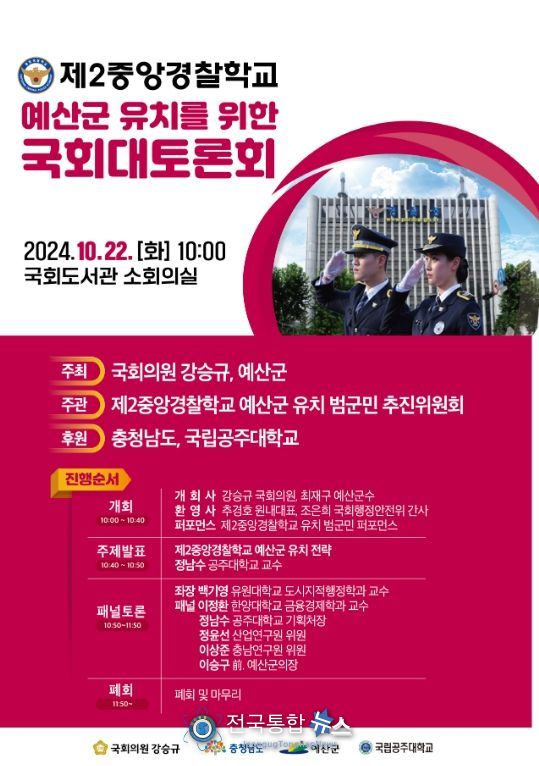 전국통합뉴스 임명락 기자 | 예산군이 강승규(예산·홍성) 국회의원과 손을 맞잡고 오는 22일 국회도서관 소회의실에서 제2중앙경찰학교 유치를 위한 국회 대토론회를 개최한다.