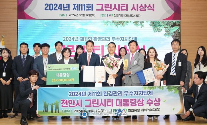 전국통합뉴스 임명락 기자 | 천안시가 17일 환경부 주관 ‘제11회 환경관리 우수자치단체 그린시티(Green City)’공모에서 전국 39개 자치단체 중 1위로 선정돼 대통령상을 수상했다.