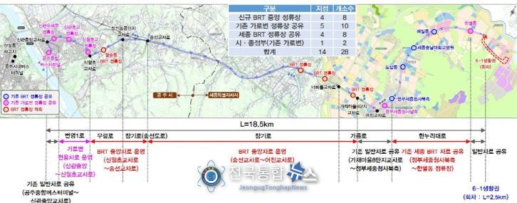 공주~세종 광역 간선급행버스체계(BRT) 구축은 공주시 종합버스터미널을 출발해 신관초교, 신월초교, 월송동, 정부세종청사, 세종충남대학교병원, 한별동까지 약 18.5km 구간에 전용도로를 구축하는 사업이다.