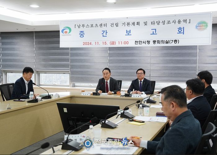 천안시는 15일 시청 중회의실에서 남부스포츠센터 건립을 위한 기본계획 및 타당성 조사 용역 중간보고회를 개최했다.