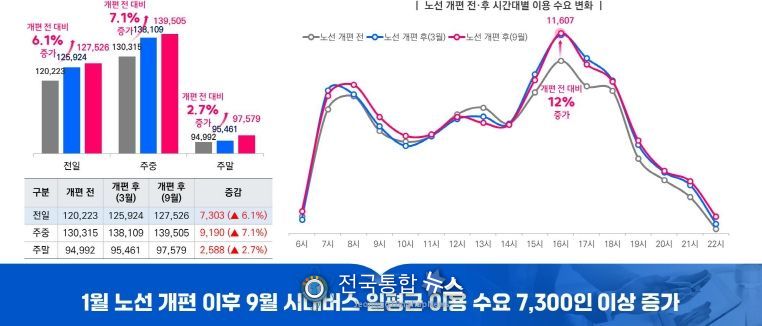 천안시는 노선 개편 전후 시내버스 교통카드 데이터 분석 결과 올해 9월 일평균 이용객은 12만 7,526명으로, 노선 개편 전인 지난해 10월 12만 223명 대비 7,303명(6.1%) 증가했다고 19일 밝혔다.