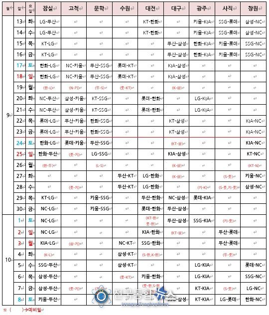 전국통합뉴스 박덕선 기자 | KBO(총재 허구연)는 오늘(13일) 2022 신한은행 SOL KBO 정규시즌 잔여 경기 일정을 확정했다.