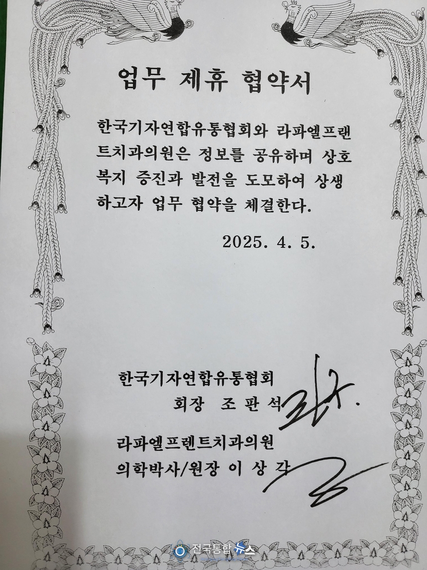 전국통합뉴스 이경수 기자 | 대전에 유일하게 한마음 복지카드 사용 가능한 라파엘프렌트치과의원은 사회적 취약계층의 건강한 일상생활을 위해 한국기자유통협회와 업무협약을 체결했다.