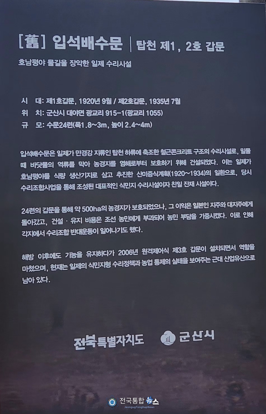 전국통합뉴스 임명락 기자 | 지난 3월 29일, 봄기운이 완연한 일요일. 전국통합뉴스 특별취재팀은 전북특별자치도 군산시 대야면 광교리 만경강 지류 탑천 하류를 찾았다. 목적지는 일제 강점기 호남평야를 식량 수탈의 거점으로 삼기 위해 건설된 [舊]입석배수문(탑천 제1·2호 갑문) 이었다.