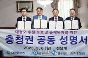 전국통합뉴스 하승헌 기자 | 이장우 대전시장을 비롯한 4개 시·도지사(대전, 세종, 충남, 충북)는 6일 청남대에서 ‘대청호 수질보호 및 규제완화를 촉구하는 공동성명서’를 발표했다. 이번 성명서는 충청권의 소중한 식수와 산업용수를 제공하고 있는 대청호의 맑은 물 보전과 청남대를 충청인의 품으로 되돌려주기 위한 염원을 담아 충청권 4개 시·도지사가 한 목소리를 냈다. 4개 시도지사는 대청호가 상수원으로써 안정성을 확보하면서 받아온 규제에 대한 정당한 지원 보상 차원에서 “첫째 대청호 수질 보호를 위하여 함께 노력하고, 불필요한 대청호 규제 완화를 위하여 공동 대응한다, 둘째, 청남대는 충북도민의 동의를 얻어 충청권의 영빈관으로 활용하는 방안을 적극 검토한다. 셋째, 충청권 주민은 청남대 이용에 있어 충북도민과 똑같은 입장료 할인 혜택을 받을 수 있도록 노력한다”고 발표했다. 이장우 대전시장은 ‘충청권 시도지사와 합심하여 대청호 수질보전과 대청호 인근 주민들의 생활개선을 위하여 긴밀히 협력해 나갈 것”이라고 말했다.
