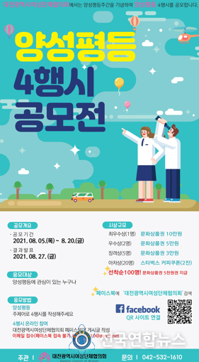 전국연합뉴스 김미리 기자 | 대전시는 양성평등주간(9. 1.~ 9. 7.)을 맞이하여‘2021 양성평등 스마트폰 사진 및 양성평등 4행시 공모전’개최하고 오는 20일까지 접수를 받고 있다고 밝혔다.