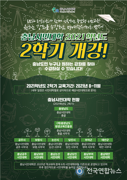전국연합뉴스 김미리 기자 | 전국 최초로 道 단위에서 운영하는 충남시민대학의 2021학년도 2학기가 개강된다.