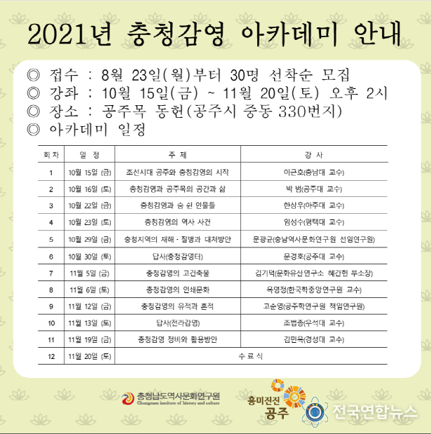 전국연합뉴스 김미리 기자 | 충청남도역사문화연구원 산하 충남역사박물관은 공주시와 함께 오는 10월 15일부터 11월 20일까지‘충청감영 아카데미’강좌를 운영한다.