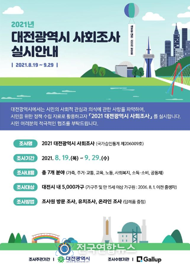 전국연합뉴스 김미리 기자 | 대전시가 8월 19일부터 9월 29일까지 2021년도 대전 사회조사를 실시한다고 밝혔다.