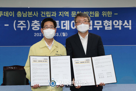 양승조 충남지사와 성기선 충청투데이 사장은 23일 도청 상황실에서 ‘충청투데이 충남본사 건립과 지역 문화 발전’을 위한 업무협약(MOU)을 체결했다.