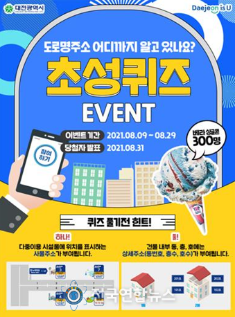 전국연합뉴스 김미리 기자 | 대전시는 전면 개정된 도로명주소를 알리기 위해 오는 25일부터 다음달 7일까지 도로명주소 초성퀴즈 이벤트를 진행한다고 밝혔다.