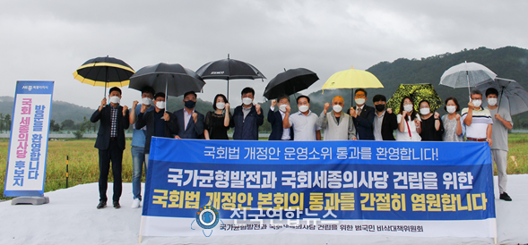 전국연합뉴스 김미리 기자 | 국가균형발전과 국회세종의사당 건립을 위한 범국민 비상대책위원회는 8월 25일 오후, 국회세종의사당 예정지에서 ‘국회법 개정안 운영소위 통과 환영 및 본회의 통과 염원 퍼포먼스’를 개최하였다.