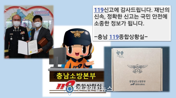 전국연합뉴스 김미리 기자 | 충남소방본부는 신속한 신고로 인명과 재산피해를 줄이는데 기여한 모범 신고자에게 처리결과를 알리고 감사의 뜻을 전하는 ‘119 신고 고마워유’를 전국 최초로 시행한다고 26일 밝혔다.