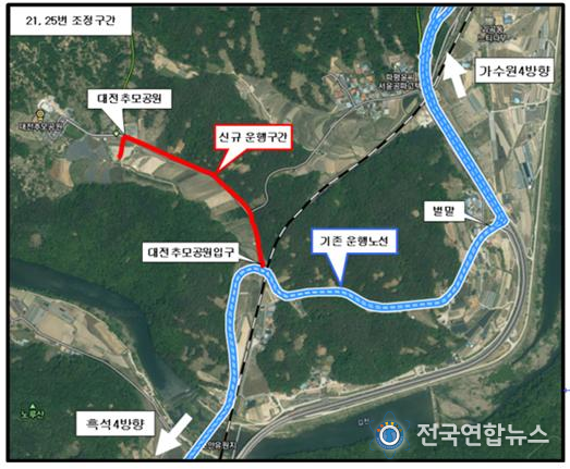 아울러, 72번 노선은 대덕구 삼정마을과 대청호로하스 캠핑장을 추가 경유하는 것으로 조정했으며, 75번은 세종시 대평리까지 운행하던 종점을 세종터미널까지 연장 운행한다.