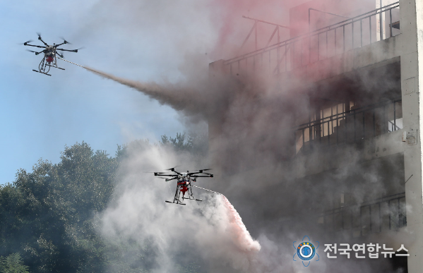 전국연합뉴스 박덕선 기자 | 충남소방본부는 9일 국내에서는 처음으로 고층건물 화재진압 군집드론시스템과 최대 이륙중량 200kg급 대형 인명구조용 드론 운항 시험을 천안의 중앙소방학교에서 실시했다.