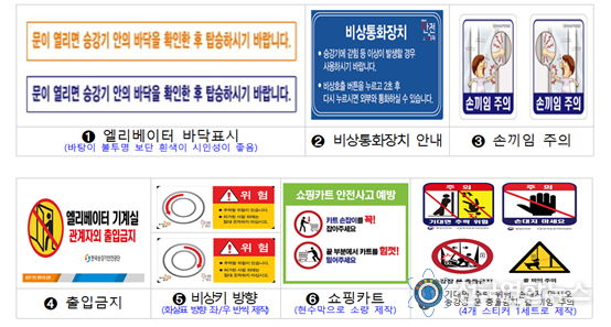 승강기 내·외부 안전 이용 안내 스티커에는 바닥 안내 표지, 비상 통화 장치, 승강기 문에 손 끼임 주의, 개 줄 끼임 주의, 비상키 방향 안내, 쇼핑카트 안전사고 예방 등의 내용을 담아 제작·배부한다.
