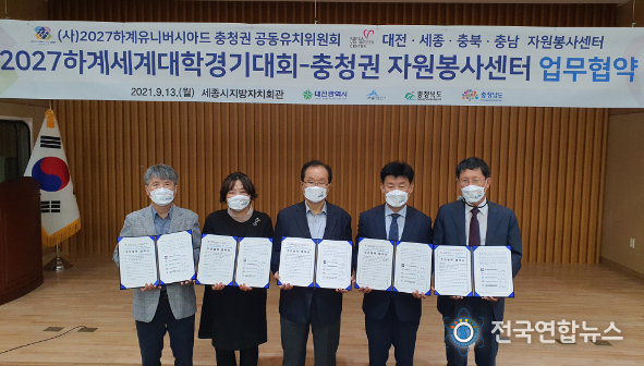 전국연합뉴스 박덕선 기자 | 2027 하계유니버시아드대회 충청권 공동유치위원회는 13일 세종시 지방자치회관에서 충청권 자원봉사센터(대전·세종·충북·충남)와 대회 유치·운영 협력을 위한 업무협약을 체결했다.