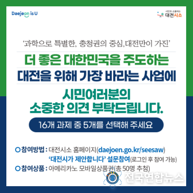 전국연합뉴스 박덕선 기자 | 대전시가 정책제안 플랫폼 ‘대전시소’를 통해 ‘제20대 대선 공약 과제 시민지지율 조사’를 진행한다고 14일 밝혔다.