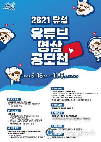 전국연합뉴스 박덕선 기자 | 대전 유성구는 9월 15일부터 11월 5일까지 참신한 영상 콘텐츠 발굴을 위한 ‘2021년 유성 유튜브 영상 공모전’을 개최한다고 14일 밝혔다.