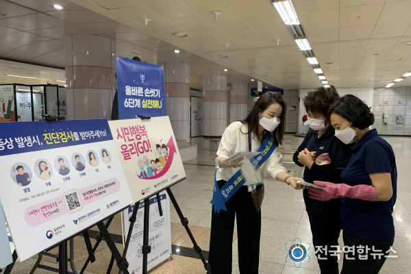 전국연합뉴스 박덕선 기자 | 대전시 감염병관리지원단은 14일 대전도시철도 1호선 시청역에서 ‘방역실천 올리Go!, 시민행복 올리Go!’란 주제의 감염병 예방 홍보 활동을 진행했다.