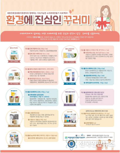 전국연합뉴스 박덕선 기자 | 세종특별자치시가 세종친환경생활지원센터와 추석 명절을 맞이해 시민들의 친환경 인식을 제고하기 위해 ‘친환경제품 선물꾸러미 특별 판매전’을 연다.