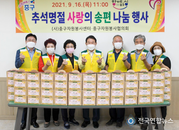 전국연합뉴스 박덕선 기자 | 대전 중구는 16일 중구자원봉사센터 주관으로 관내 어려운 이웃 500세대에 송편을 전달했다고 밝혔다.