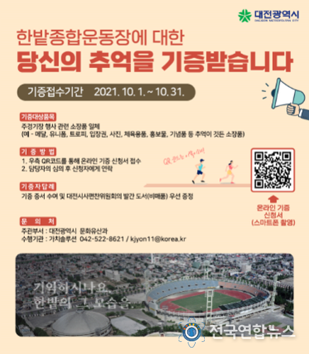 전국연합뉴스 박덕선 기자 | 대전시는 10월 한 달간 한밭종합운동장과 관련한 자료를 소장하고 있는 시민을 대상으로 기증 캠페인을 추진한다고 밝혔다.