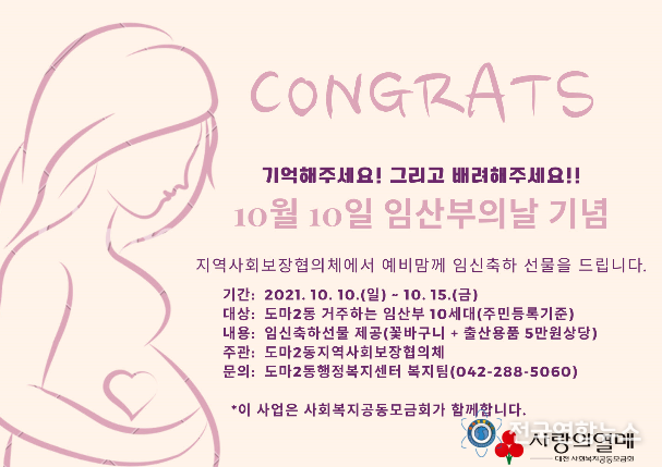지원대상은 도마2동에 거주하는 임산부 중 관내 통장 또는 지역사회보장협의체 위원의 추천을 받아 선정되며, 임신축하 메시지를 담은 꽃바구니 및 출산용품 등이 선물로 제공될 예정이다.