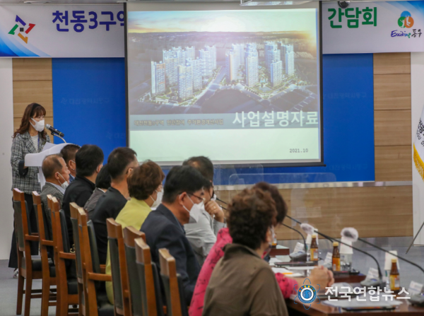 전국연합뉴스 박덕선 기자 | 대전 동구는 7일 구청 회의실에서 천동3구역 사업설명과 함께 행정구역 경계 조정 관련 주민 의견을 수렴하기 위한 주민간담회를 개최했다.