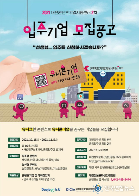전국연합뉴스 박덕선 기자 | 대전시는 10월 15일부터 11월 5일까지‘대전콘텐츠기업지원센터’에 입주할 16개 기업을 2차로 모집한다고 밝혔다.