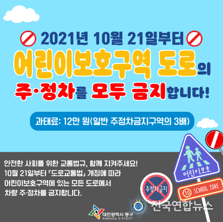 전국연합뉴스 박덕선 기자 | 대전 동구는 이달 21일부터 동구 지역 어린이보호구역 내 도로에서의 주‧정차가 전면 금지된다고 20일 밝혔다.