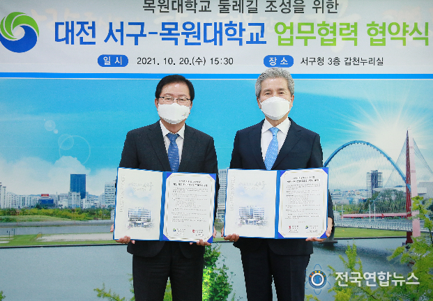 전국연합뉴스 박덕선 기자 | 대전 서구는 20일 구청 갑천누리실에서 목원대학교와 학교 주변 산림휴양 공간 창출 및 휴식을 위한 '둘레길 조성' 업무협약을 체결했다.