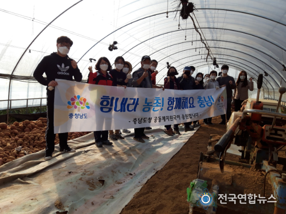 이날 공동체지원국 직원 20여 명은 코로나19 장기화로 외국인 인력 수급이 지연되며 어려움을 겪고 있는 홍성군의 한 고구마 농가를 방문해 고구마 수확 작업을 도왔다.