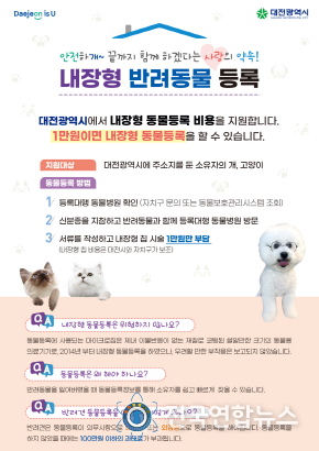 전국연합뉴스 박덕선 기자 | 대전시가 내장형 동물등록 지원범위를 확대한다. 반려견 인식표또는 외장형을 내장형으로 변경하는 경우에만 지원하던 것을 10월 25일부터 신규로 등록하는 경우에도 지원한다.