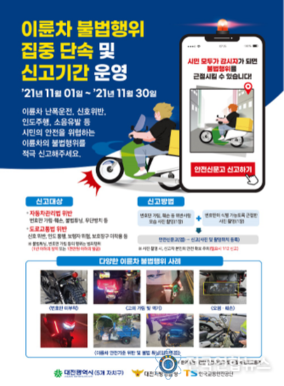 대전시는 이기간동안 이륜차 난폭운전, 신호위반, 인도주행, 소음유발 등 시민 안전을 위협하는 이륜차 불법행위에 대한 집중단속을 실시한다고 밝혔다.