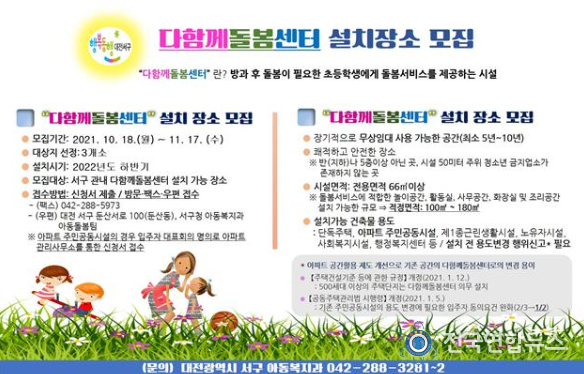 전국연합뉴스 박덕선 기자 | 대전 서구는 2022년도 방과 후 초등 돌봄 서비스를 제공할 다함께돌봄센터 설치 장소 이달 17일까지 공개 모집한다.