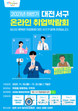전국연합뉴스 박덕선 기자 | 대전 서구는 위드 코로나 시대를 맞아 취업률 제고를 통한 경기회복을 지원하고자, 이달 15일부터 21일까지 ‘2021년 하반기 온라인 취업박람회’를 개최한다고 8일 밝혔다.