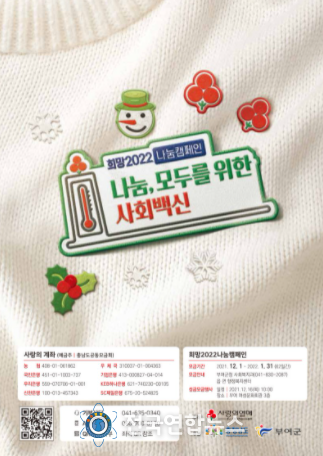 전국연합뉴스 임명락 기자 | 부여군은 연말연시 어려운 이웃돕기 모금운동 ‘희망 2022 나눔캠페인’을 12월 1일부터 2022년 1월 31일까지 62일 동안 전개한다고 밝혔다.