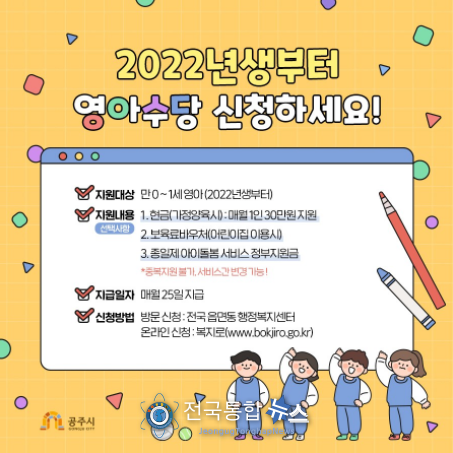 대상은 올해 태어나는 출생아를 대상으로 가정에서 양육할 경우 소득과 관계없이 23개월까지 매월 현금 30만 원을 지급한다.