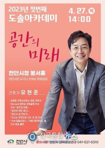 전국통합뉴스 임명락 기자 | 천안시는 오는 27일 오후 2시 시청 봉서홀에서 ‘공간의 미래’라는 주제로 유현준 건축가를 초청해 첫 번째 도솔아카데미 강연을 진행한다.