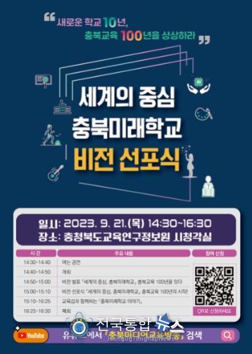 전국통합뉴스 최상호 기자 | 충청북도교육청은 21일 오후 2시 30분, 교육연구정보원 시청각실에서 ‘세계의 중심, 충북미래학교’ 비전 선포식을 개최했다.