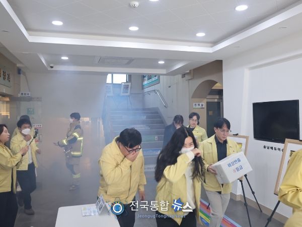 이날 훈련은 훈련시간을 미리 고지하지 않고 화재지점을 즉석에서 설정하고 현장감 넘치게 실제 재난상황에 맞는 훈련으로 진행됐다. 또한, 대피 후 청사 본관 야외에서 직원들이 직접 소화기로 화재진압을 실시해봄으로써 화재 상황에 대한 대처법을 익히는 시간도 가졌다