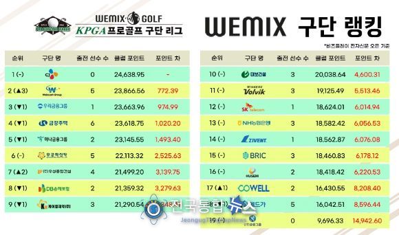 ‘제38회 신한동해오픈’ 종료 후 ‘위믹스 구단 랭킹’ 5위로 내려앉았던 웹케시그룹은 18일 끝난 ‘비즈플레이 전자신문 오픈’에서 구단 별 포인트 1000포인트에 2위 전성현(29.웹케시그룹)이 600포인트, 공동 9위 이원준(37.웹케시그룹)이 285포인트, 공동 28위 현정협(39.쿠콘)이 130.6포인트, 공동 60위 장승보(26.웹케시그룹)가 7.5포인트, 김태훈이 5포인트를 합작하며 누적 2만 3866.56로 지난 주 대비 3계단 상승한 ‘위믹스 구단 랭킹’ 2위를 기록했다.